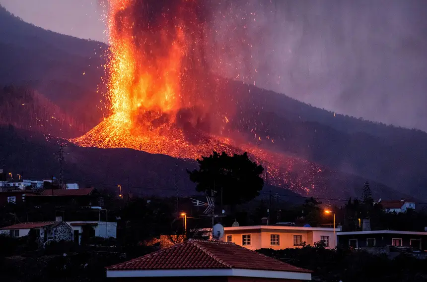 A erupção do vulcão Cumbre Vieja em La Palma está causando avanço de lava e destruição nas Ilhas Canárias Espanha. A lava do vulcão Cumbre Vieja que entrou em erupção no domingo em La Palma nas ilhas Canárias já destruiu mais de 200 casas e campos agrícolas. O novo fluxo de lava do vulcão da ilha espanhola de La Palma com temperaturas até 1240 graus Celsius destruiu os poucos edifícios ainda intactos a norte de Todoque disseram hoje as autoridades locais.